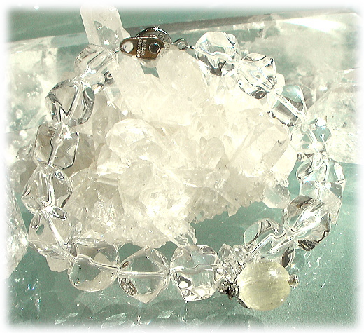 光の透過が、立方体の神秘的な形の水晶の壁面内で 無限の拡がりを見せ 美しさと強い光の浄化力とエネルギーがメインストーンと持ち主をさらに輝かせながら 着けている時はストレートにとりこめるような「光」として感じ取ることができます。 ブレスレットとしてもとても美しく 大粒のクリスタルの煌きと存在感が 天然石ブレスというよりは、高級感のあるクリスタルアクセサリー系のデザインとして とてもセンシティブなフォルムによる輝きと素敵な存在感とともに
