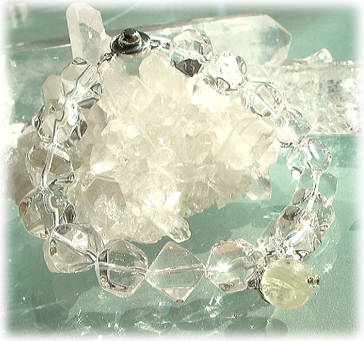 光の透過が、立方体の神秘的な形の水晶の壁面内で 無限の拡がりを見せ 美しさと強い光の浄化力とエネルギーがメインストーンと持ち主をさらに輝かせながら 着けている時はストレートにとりこめるような「光」として感じ取ることができます。 ブレスレットとしてもとても美しく 大粒のクリスタルの煌きと存在感が 天然石ブレスというよりは、高級感のあるクリスタルアクセサリー系のデザインとして とてもセンシティブなフォルムによる輝きと素敵な存在感とともに