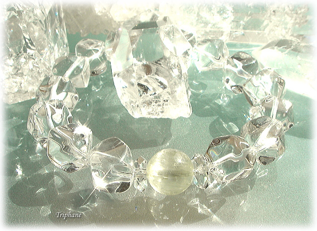 光の透過が、多面体の神秘的な形の水晶の壁面内で 無限の拡がりを見せ 美しさと強い光の浄化力とエネルギーがメインストーンと持ち主をさらに輝かせながら 着けている時はストレートにとりこめるような「光」として感じ取ることができます。 ブレスレットとしてもとても美しく 大粒のクリスタルの煌きと存在感が 天然石ブレスというよりは、高級感のあるクリスタルアクセサリー系のデザインとして とてもセンシティブなフォルムによる輝きと素敵な存在感とともに