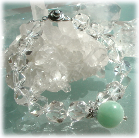 光の透過が、立方体の神秘的な形の水晶の壁面内で 無限の拡がりを見せ 美しさと強い光の浄化力とエネルギーがメインストーンと持ち主をさらに輝かせながら 着けている時はストレートにとりこめるような「光」として感じ取ることができます。 ブレスレットとしてもとても美しく 大粒のクリスタルの煌きと存在感が 天然石ブレスというよりは、高級感のあるクリスタルアクセサリー系のデザインとして とてもセンシティブなフォルムによる輝きと素敵な存在感とともに