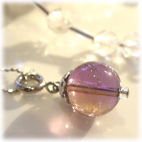 サードアイ(直観力)を増幅させるアメジストと、 明るい方向性へと導き肉体との調和をもはかるシトリンが同居する石です。