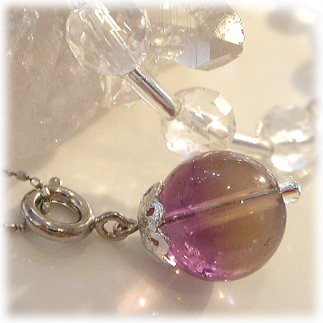 サードアイ(直観力)を増幅させるアメジストと、 明るい方向性へと導き肉体との調和をもはかるシトリンが同居する石です。