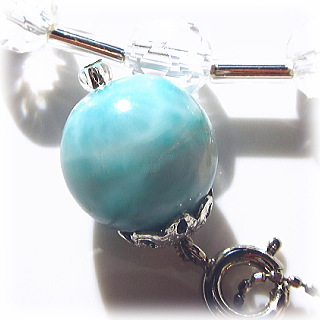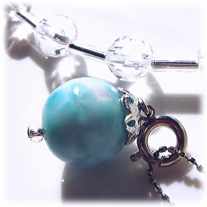 「水」と「大空」のエッセンス・・・水は感情、大空は思考・・・ ラリマーはハートの感情と頭脳の思考とのバランスを たとえそれがかき乱されているものだとしても 調和のイメージを織り成す天使の糸のような安らかな波動で 中和させ解消する手助けを行います。 ラリマーは火山性の鉱物で 熱く煮えたぎったマグマから形成されますが それからは想像もつかないような クールでソフトなブルートーンの表情を抱いています。 自分の中にあるネガテイブなエネルギーを いかにクールダウンさせていくか そして、どうポジティブに変換させ、飛躍させていくか その答えともなるカリスマ的な導きをそえ 部分的に過剰なエネルギーを、他の不足している箇所へ 生命エネルギーやポジティブなエネルギーとして送り込んでくれます。 クリスタル・ヒーリングの世界でも 他の石たちのサポート力(意味的な組み合わせ)と共鳴させることによって 精神・肉体の患部へのヒーリングを画期的に行い 新しい循環をつくり広げていきます。 また、チャクラにおける生命力バランスの流れを開いたり エネルギーの流れにおけるバランス調整まで行います。 また、ラリマーは天上的な性質の石なので 葛藤で悩んでいる時、試練を感じている時 肉体の衰えが気になりだした時など 一緒に瞑想したり、持ち歩いたり、身につけることで 新しい価値観を生み出させ 自信の育みや真実の探求、安らぎを与え