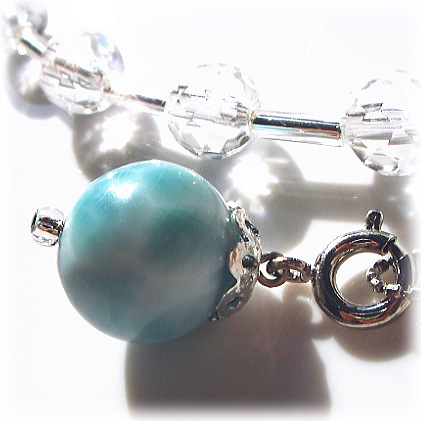 「水」と「大空」のエッセンス・・・水は感情、大空は思考・・・ ラリマーはハートの感情と頭脳の思考とのバランスを たとえそれがかき乱されているものだとしても 調和のイメージを織り成す天使の糸のような安らかな波動で 中和させ解消する手助けを行います。 ラリマーは火山性の鉱物で 熱く煮えたぎったマグマから形成されますが それからは想像もつかないような クールでソフトなブルートーンの表情を抱いています。 自分の中にあるネガテイブなエネルギーを いかにクールダウンさせていくか そして、どうポジティブに変換させ、飛躍させていくか その答えともなるカリスマ的な導きをそえ 部分的に過剰なエネルギーを、他の不足している箇所へ 生命エネルギーやポジティブなエネルギーとして送り込んでくれます。 クリスタル・ヒーリングの世界でも 他の石たちのサポート力(意味的な組み合わせ)と共鳴させることによって 精神・肉体の患部へのヒーリングを画期的に行い 新しい循環をつくり広げていきます。 また、チャクラにおける生命力バランスの流れを開いたり エネルギーの流れにおけるバランス調整まで行います。 また、ラリマーは天上的な性質の石なので 葛藤で悩んでいる時、試練を感じている時 肉体の衰えが気になりだした時など 一緒に瞑想したり、持ち歩いたり、身につけることで 新しい価値観を生み出させ 自信の育みや真実の探求、安らぎを与え