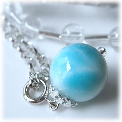 「水」と「大空」のエッセンス・・・水は感情、大空は思考・・・ ラリマーはハートの感情と頭脳の思考とのバランスを たとえそれがかき乱されているものだとしても 調和のイメージを織り成す天使の糸のような安らかな波動で 中和させ解消する手助けを行います。 ラリマーは火山性の鉱物で 熱く煮えたぎったマグマから形成されますが それからは想像もつかないような クールでソフトなブルートーンの表情を抱いています。 自分の中にあるネガテイブなエネルギーを いかにクールダウンさせていくか そして、どうポジティブに変換させ、飛躍させていくか その答えともなるカリスマ的な導きをそえ 部分的に過剰なエネルギーを、他の不足している箇所へ 生命エネルギーやポジティブなエネルギーとして送り込んでくれます。 クリスタル・ヒーリングの世界でも 他の石たちのサポート力(意味的な組み合わせ)と共鳴させることによって 精神・肉体の患部へのヒーリングを画期的に行い 新しい循環をつくり広げていきます。 また、チャクラにおける生命力バランスの流れを開いたり エネルギーの流れにおけるバランス調整まで行います。 また、ラリマーは天上的な性質の石なので 葛藤で悩んでいる時、試練を感じている時 肉体の衰えが気になりだした時など 一緒に瞑想したり、持ち歩いたり、身につけることで 新しい価値観を生み出させ 自信の育みや真実の探求、安らぎを与え