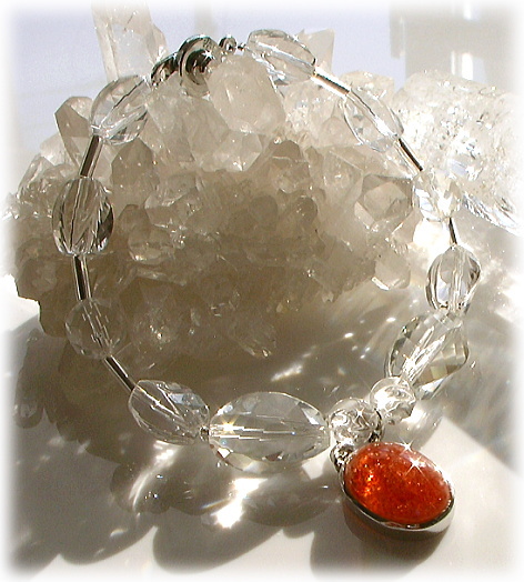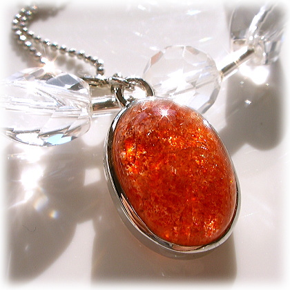 生命力あふれる色彩の中に虹色の光を反射させるような照りをちりばめているサンストーン。