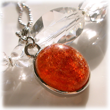 生命力あふれる色彩の中に虹色の光を反射させるような照りをちりばめているサンストーン。