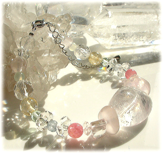 やはり「虹」がコンセプトになっていて 太陽の光にかざしながら石たちの表情もキラキラ美しく 今回のメインストーンを中心に、クラウンチャクラからの光を ハートチャクラいっぱいに溜め込んでいくイメージのブレスです。
