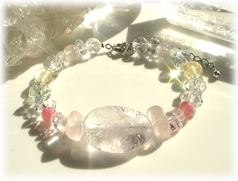 天使の石セレスタイトの天上的なエネルギーを 強い輝きを持つ宝石質のモルガナイトへと繋げているのが 橋渡し上手なピンクトルマリン とてもストレートにハートチャクラに そのエネルギーをおろしていくことを意図しています。