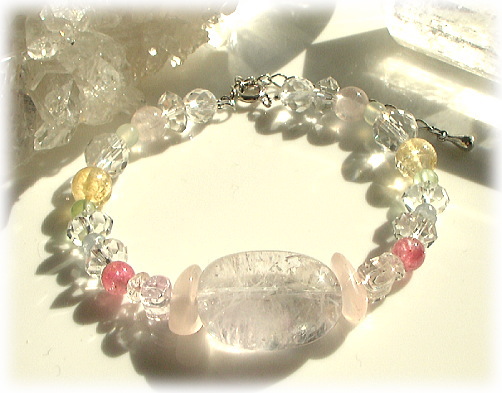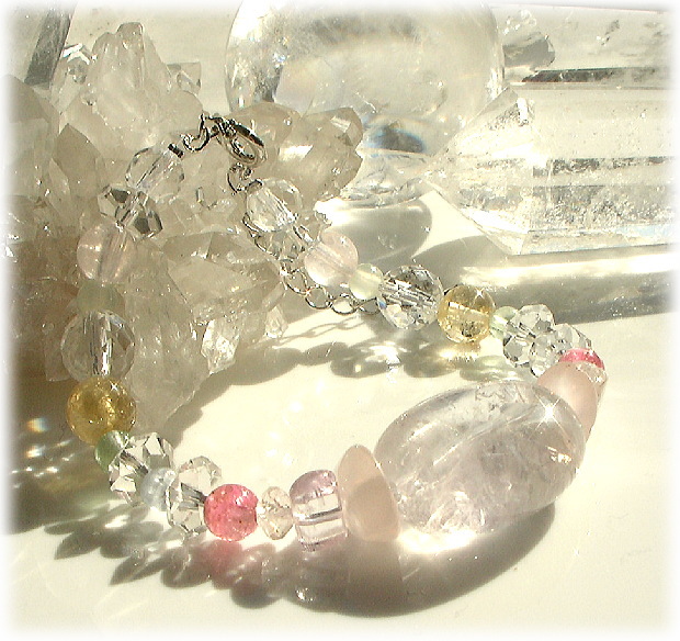 やはり「虹」がコンセプトになっていて 太陽の光にかざしながら石たちの表情もキラキラ美しく 今回のメインストーンを中心に、クラウンチャクラからの光を ハートチャクラいっぱいに溜め込んでいくイメージのブレスです。
