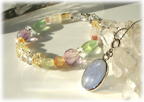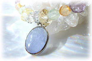 その根元は「問題あるカルマ」の原因の解消を 無意識レヴェルで治癒させるエネルギーと 天上的(ある意味宇宙的)なエネルギーとの接触をはかれる 神秘の同調性にあるようです。 物事を正しく見極めたい時、 過剰なストレスに精神的だけでなく肉体的にも負けてしまいそうなときに ぴったりの石で、和名では「ぶどう石」とも呼ばれています。 生命力や活力そのものを封じ込めたようなイエローカラーと 穏やかなブルーの光が同居し 淡いマスカットグリーンの美しいカラーが印象的です。
