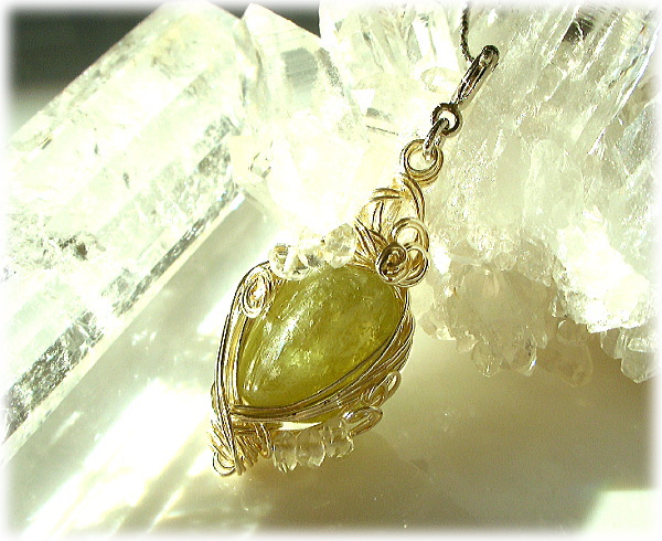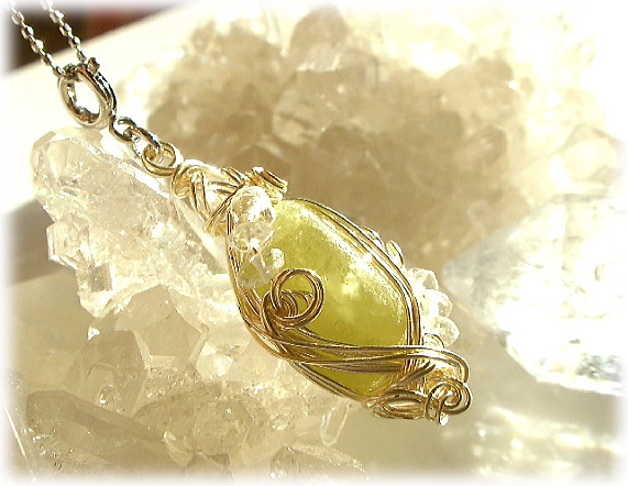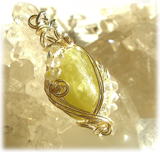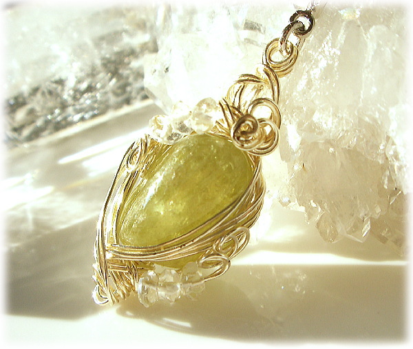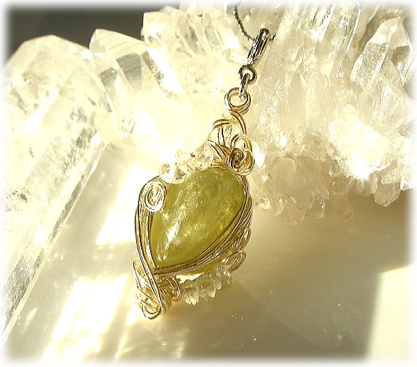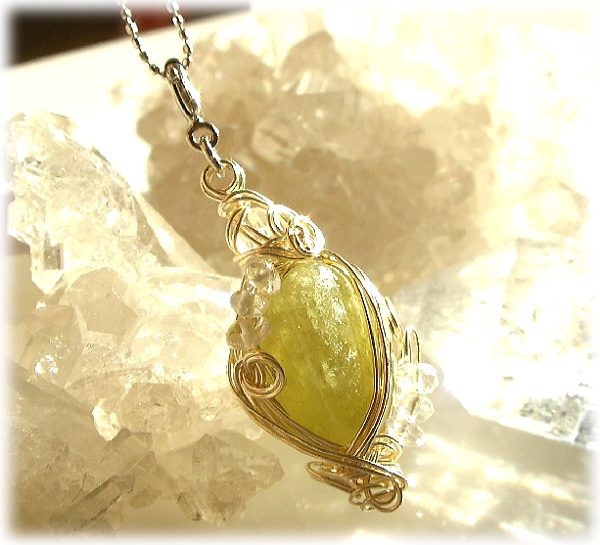 優美なワイヤーワークの曲線の中、周囲にちりばめた美しい水晶たちとともに