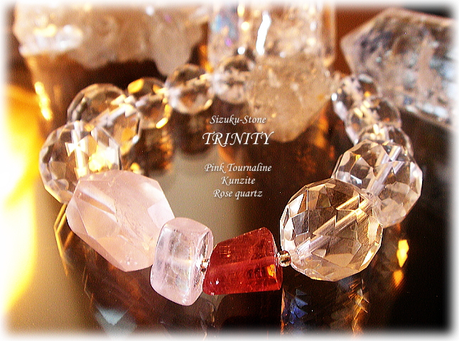 色濃くヴィヴィッドでありながら透明感にあふれる華やかなピンクトルマリン原石 透明感のあるライラックピンクで聡明な優しさを持つクンツァイト ふんわりとファーデンが入ったマスタークリスタルとして慈愛に満ちたローズクォーツ… 3石が生み出す感性と調和を大切に トリニティ・ブレスレットとして、ボリューム(エナジー)調和も相性抜群の3石をセレクトいたしました。 (大粒でキラキラと輝くレムリアンクリスタルとともに華やかで美しい環をつくっています) ハートチャクラのトリニティ(三位一体)として… まずローズ・クォーツが ![]() 傷やトラウマを感じとり 愛を与えたり受け取ったりするハートの能力を押さえつけていた苦しみが溜め込まれていることも感じとり それを理解し、溶かし始めるのです。 愛があることが感じられると 愛の流れを抑制していた悲しみ、恐怖、憤りは 深い自己実現の感覚に置き換えられ まずは自分を愛することの大切さを教えてくれます。 自分を愛することから 何もかもが始まるのだということを… そしてクンツァイトが ![]() ローズクォーツの手ほどきした内面化した自己への愛を 外側に表現できるように活性化させていきます。 ゆっくりと聡明に、ともに育み その活性化の段階において、トータルな明け渡しと、 過去や未来の不安などでハートに縛り付けられている恐怖や悲しみの癒しを行い 自分の心にある本質的なマインドのバランスをとっていきます。 さらにピンクトルマリンが、 ![]() ハートを悲しみや恐怖に縛り付けている障害まで ダイナミックに変容させ、燦然と輝きを解放していきます。 クンツァイトがピンクトルマリンへと明け渡すことで その愛は外部へと解き放たれていくのです。 鮮やかなピンクは、長い間溜め込んでいる破壊的な感情を理解し 解消させる振動数でハートチャクラをヴァイブレートさせます。 ハートがこうした過去の印象からクリアーになると 感情の本当の目的を知るようになります。 それは愛が豊かに溢れていることや喜びを 表現することができるようになります。 傷やトラウマを脱し、愛を育み、燦然と自身が華やかに輝いていける変容… ひとつの石だけでは成し得ない「流れと循環」がそこに実現するのです。 クリスタルヒーリングの世界では この3石(ローズクォーツ・クンツァイト・ピンクトルマリン)がそろうことで ひとつの循環をつくりあげることを 「ハートチャクラのトリニティ」と呼んでいます。 身につける素晴らしさはもちろん 順に眺めていくだけでも 順にふれていくだけでも 何かを感じませんか。。 (きっと感じられると思います) この流れは 日々のちょっとした傷も修復してくれる優しさにも満ちています。 ![]() SIZUKU-STONEのハートチャクラのトリニティで一番大切にしていることは・・・ セットとなるために選んだ3石それぞれが それぞれ巡り逢う必然としての素晴らしい共鳴感を持てるかどうかということです。 お互いにとても強く強く響きあえることがトリニティとして大切だと思うのです。 この3石ももちろん・・・この3石ならではの流れのような循環を確かに持っています。 それぞれ3つの輝きの感性が 美しく完結できているような 美しく何かを奏ではじめるようなトリニティです。 今回の3石は、それぞれが巡り逢う必然があったかのような・・・素晴らしい共鳴感を持っています。 (お互いにとても強く強く響きあっているようです) ![]() トラウマからの脱却・癒し・・・傷ついた心を癒しながら(ローズクォーツ) 自己愛をベースにさらなる愛情と自信への活性化を行い(クンツァイト) その気づきとバランスを華やかに燦然と外部へと解放していく(ピンクトルマリン)・・・ 傷を抱擁・癒しながら、柔らかでピュアな「女性としての心」を活性化させ 自分の中の愛、他者への愛、他者からの愛を実感できる力を教えてくれながら 「自信を持ってコミュニケーションへとつなぐことのできる本来の輝き」を 精神に肉体に…魂に取り戻させてくれます。 1石ずつでも充分に素晴らしい石たちが 3石そろって奏でるトリニティのエネルギー感の豊かさを 実感していただけますよう・・・ 「自分のための3石」との出逢いとご縁が実現できますように…*
