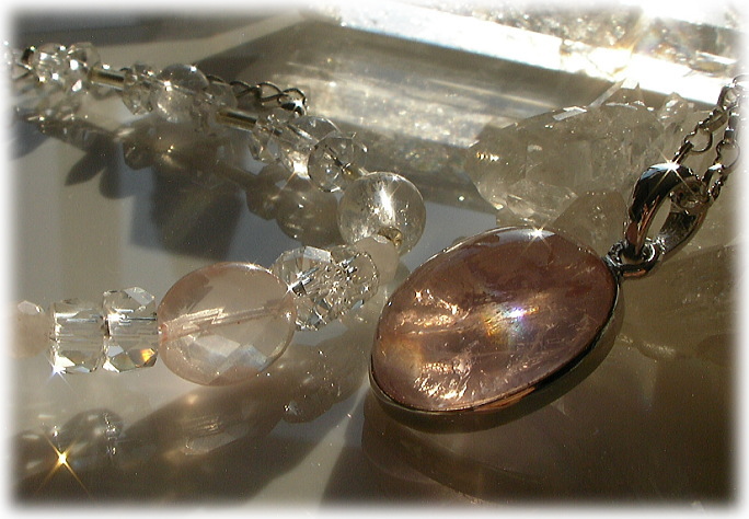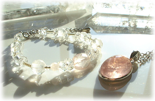 胸元とブレスのローズクォーツたちが柔らかな光の中で共鳴しはじめた時