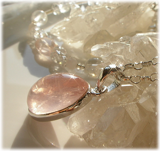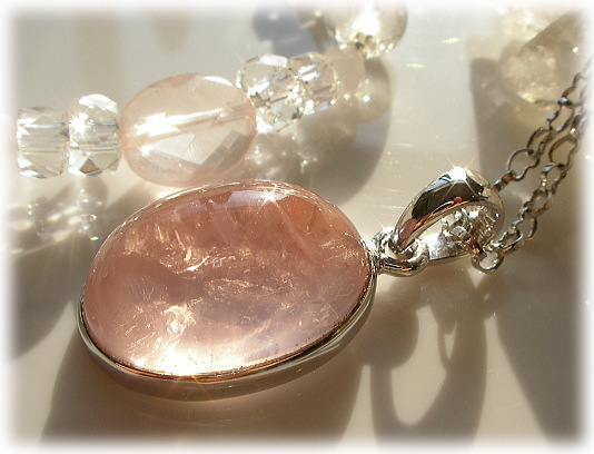 ペンダントトップのローズクォーツは天使の羽のようなニュアンスが内包され